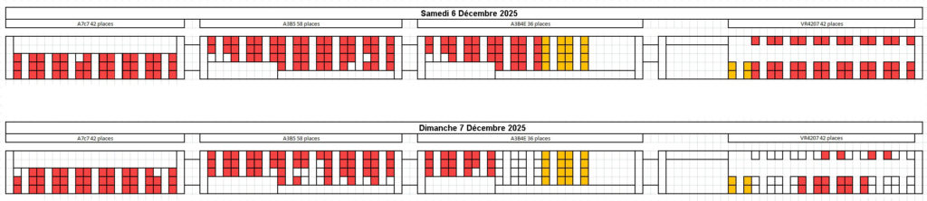 En Blanc les places disponibles, en Rouge et Orange les places non disponibles.